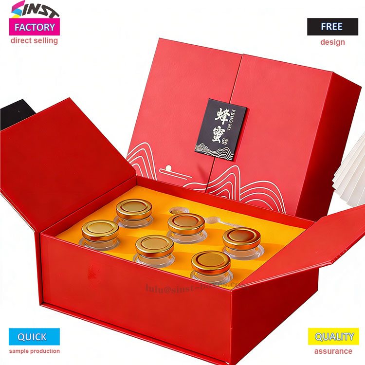 Denna röda honungspresentförpackning kombinerar eleganta vågmönster med högkvalitativ hård kartong, med en vikbar struktur för enkel förvaring och transport. Honungspresentförpackning stöder en mängd olika storlekar av glasburkar (för honung/tonic) och levereras med en anpassad skuminsats för att hålla innehållet. Mycket lämplig för semesterpresenter, affärspresenter och hälsoproduktförpackningar, i överensstämmelse med presentpreferenser på de europeiska, amerikanska och sydostasiatiska marknaderna. Denna låda är lätt, snygg och kostnadseffektiv samtidigt som den ökar produktvärdet.