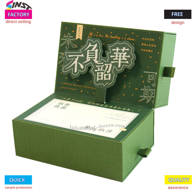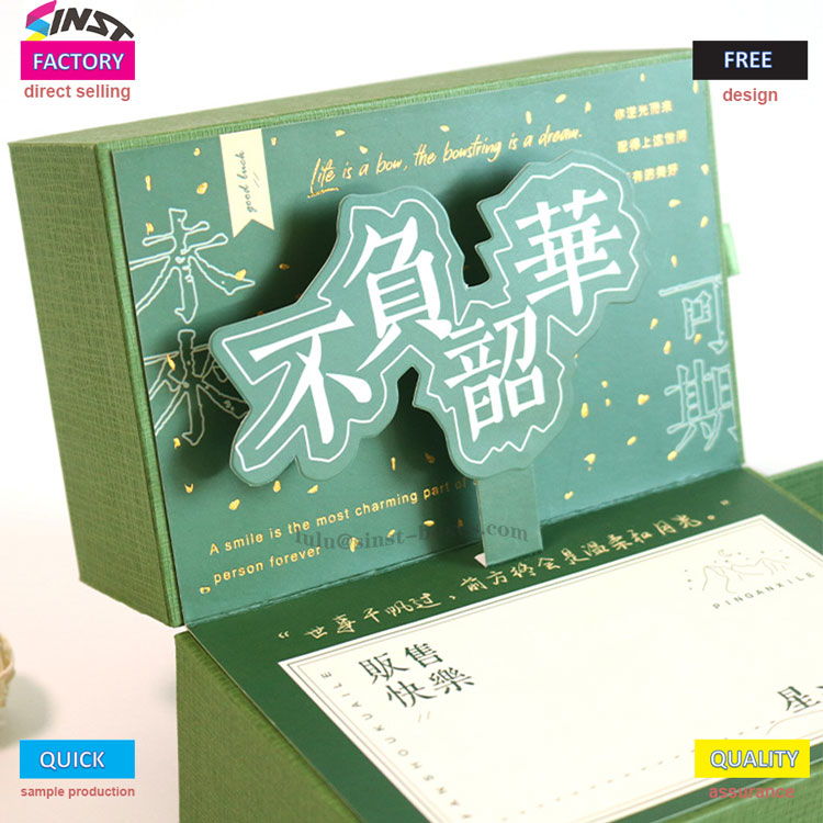 Kroppen på denna lyxiga presentförpackning är täckt med grönt tygtexturmaterial, som har en delikat touch; Lådlocket är centrerat kring de ihåliga tredimensionella tecknen "Never Give Up to Youth", omgiven av små orange dekorationer. Ovanför är orden tryckta på engelska som "A smile is the most charming", förmedlar en varm atmosfär och förmedlar de känslor som presentförpackningen bär.