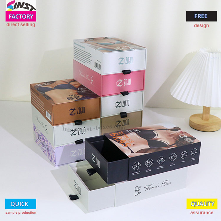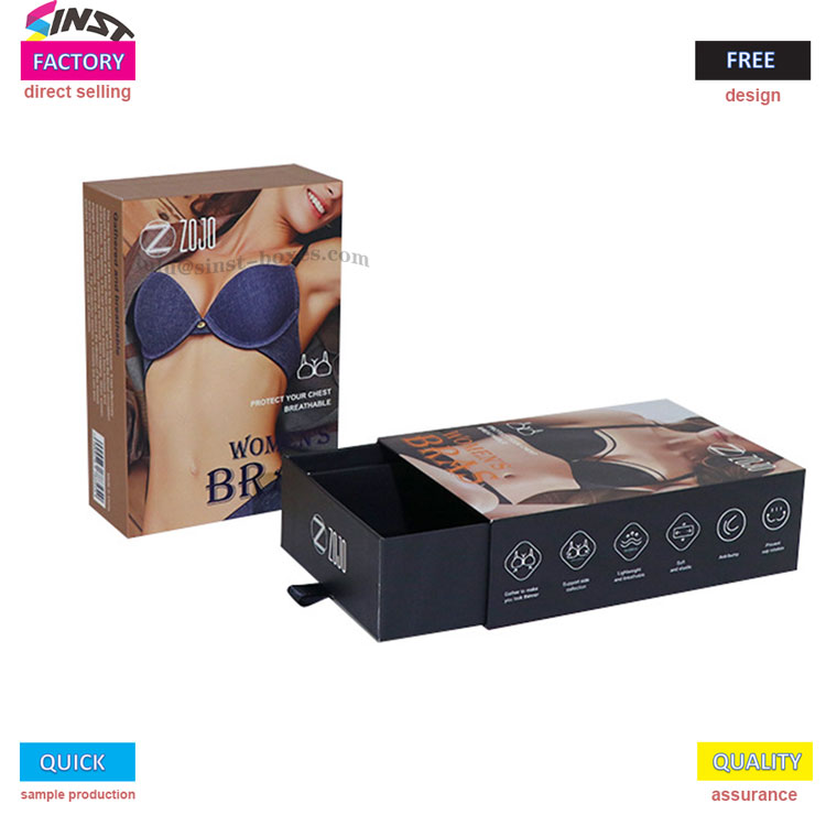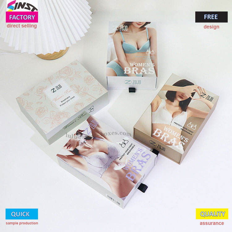 Om du väljer släta sidenunderkläder, framhäver det perfekta tygets exklusiva känsla genom att para ihop dem med en presentförpackning i Silk-bh; Om du strävar efter kvalitet, kan det utsökta trycket och hantverket i presentförpackningen för Premium-bh förstärka stilen fullt ut; För dig som tycker om en mjuk och söt känsla, de fräscha mönstren på Cute BH-presentförpackningen berör direkt unga tjejers hjärtan Oavsett vilken typ av känsla du vill ha, kan denna presentförpackning skräddarsys för att passa tonen i underkläderna och kan snabbt anpassas utan att vänta för länge.