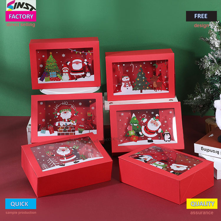 Denna julgodislåda har en varm röd bakgrund, en rektangulär boxkropp och ett genomskinligt fönster, som ett fönster för att skymta en vintersaga. Denna julgodislåda tillverkad av hårt pappersmaterial, som kan visa godisarna inuti och har en viss grad av stabilitet. Den kan anpassas till dagliga föremål som choklad, desserter, kakor, gummies, etc; Det är inte bara en söt behållare för godis, utan också en juldekoration på skrivbordet. Att ge det till människor för personligt bruk kan lysa upp semesterstämningen, vilket gör varje sötma insvept i en känsla av ceremoni.