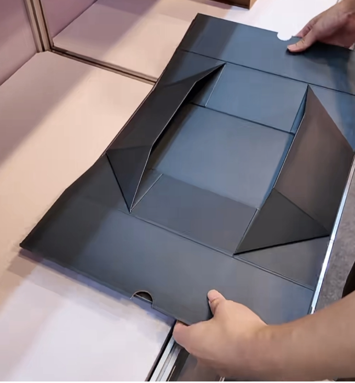 Den här fällbara papperslådanär främst i mörkgrå färg, med en plan yta men dold uppfinningsrikedom - lådkroppen har tydliga delningsområden (som visas i figur 1), som leder användare att enkelt utvecklas eller vika genom veck. Håll båda ändarna med båda händerna och tryck dem försiktigt för att förvandla papperslådan från ett platt tillstånd till en tredimensionell lagringslåda, vilket sparar 70% av transportutrymmet.