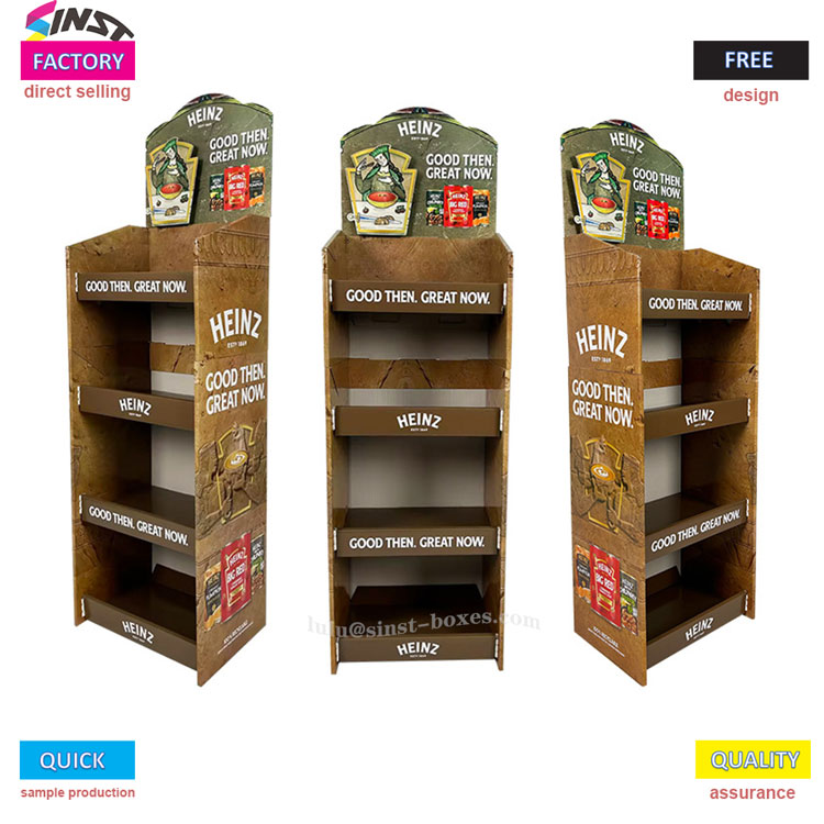 Kartongstället för tomatsås är centrerat kring "stark varumärkesexponering+praktisk display", speciellt designad för tomatsås och lämplig för detaljhandelsscener som stormarknader och närbutiker. Tomatsåsdisplayen ger fyra lager lagringsutrymme för lagerplacering av olika specifikationer av tomatsås. Från standardflaskor till provprodukter för små förpackningar kan de "placeras i sina respektive positioner" smidigt och utan att fastna.